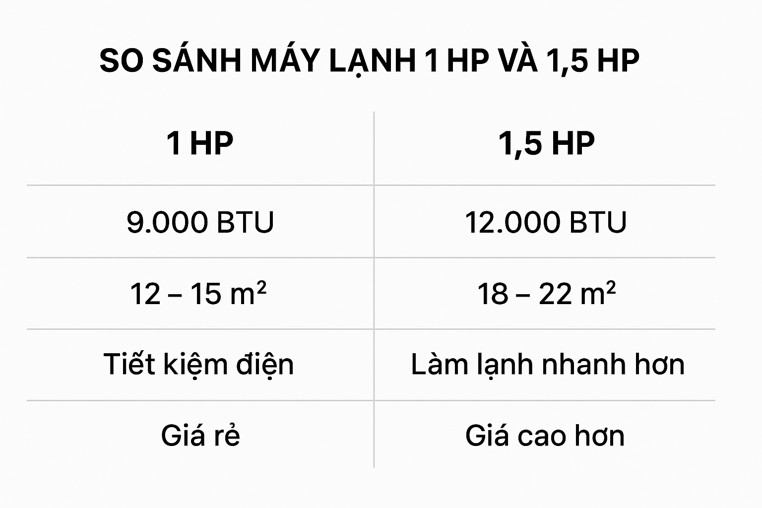1 HP tương đương khoảng 9.000 BTU, có khả năng làm lạnh cho phòng khoảng 12 – 15 m².